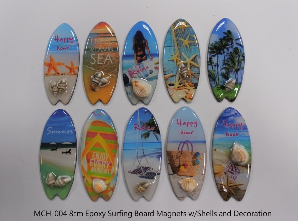 8CM EPOXY SURFING BOARD MAGNET WITH SHELLS AND DECORATION